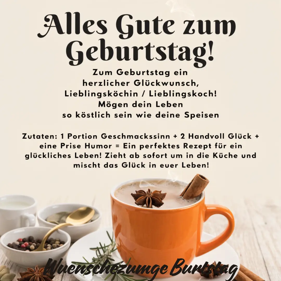 Was sagt man zu einem Koch, der jedem Moment des Lebens Geschmack verleiht? Wie formuliert man einen Geburtstagsgruß für jemanden, der aus einfachen Zutaten etwas Besonderes zaubert? Köche sind kreativ, fleißig und voller Leidenschaft. Ihre Arbeit bringt Menschen zusammen und schafft Erinnerungen rund ums Essen.